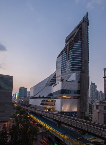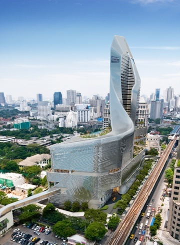 Located within the former gardens of the British Embassy along Ploenchit Road, Bangkok’s primary commercial artery, the 1.5 million sq ft project, commissioned by Central Retail Corporation, merges a seven storey luxury retail podium and a 30 storey 5 star hotel tower into a cohesive and sinuously twisting shape.